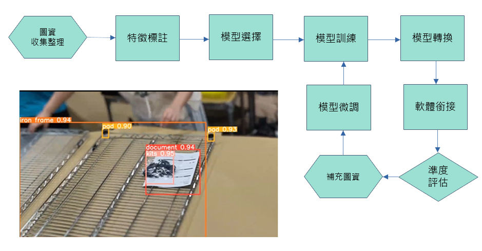 - 檢測產線上的組裝產品是否有缺漏,過去的人工組裝缺漏,依靠的是下一站檢查點來攔檢,透過視覺AI可以分辨出組裝的產品是否有缺件情況,從而降低生產組裝的缺件率,提高生產良率