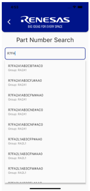 If you have a Renesas part number and wonder about the specification and feature set, simply key it in to the part number search interface to get full details. The smart algorithms support your input with an auto completion dialog and pre-selections to keep your efforts to a minimum.
